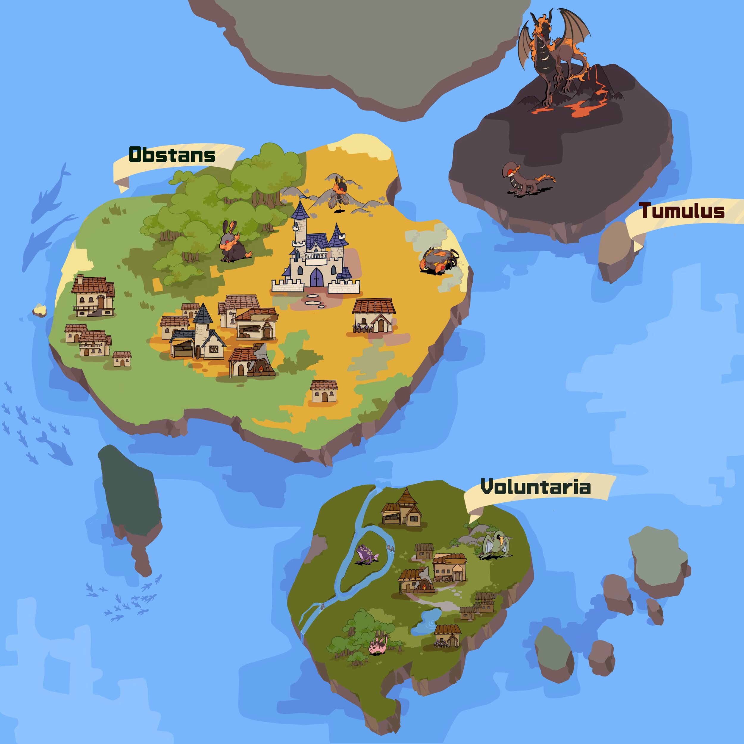 The country including three main islands: Obstans island, Voluntaria Island and Tumultus island. Each island have different building style and creature due to different environment.